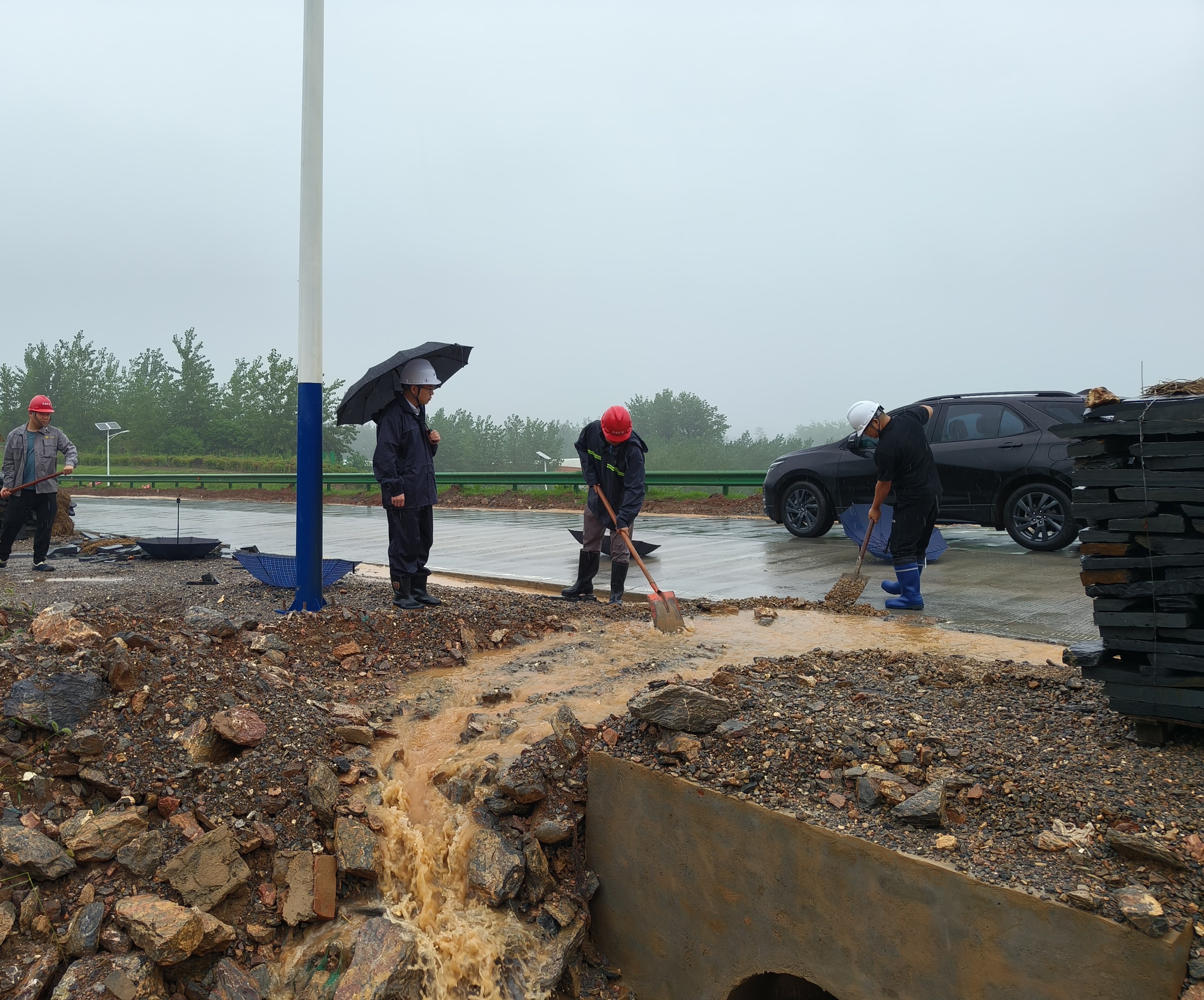 搶險現(xiàn)場,黨員干部帶頭,通過沙包筑堤、開挖排水溝等措施進行預(yù)防,同時對礦區(qū)、加工區(qū)開展全面隱患排查。中午,水塘漫堤隱患消除。